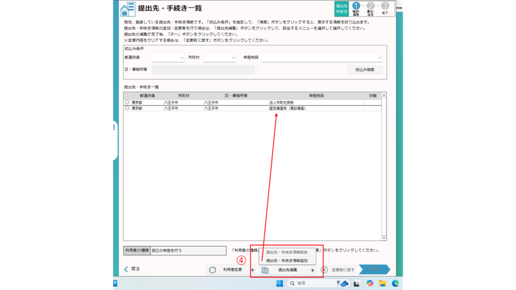 ④ 提出先編集で「固定資産税(償却資産)」を追加